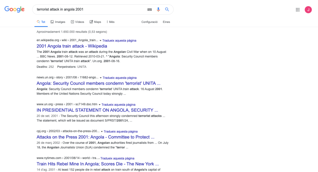 Les imatges són delatores. Ja amb Google es troben les diferències entre el tractament d’ambdós fets. Des d’un punt de vista quantitatiu, l’accident a Espanya té quasi 15 milions de resultats i cerques, mentre que el d’Angola en té poc més d’1 milió. A més, les dates de publicació dels articles també són concloents. I és que en el mateix any dels atacs, la cobertura que van rebre varia moltíssim: sembla que l’accident d’Angola ha guanyat protagonisme amb els anys. Per altra banda, podem fer una observació qualitativa. L’accident del 2004 va tenir en gran part la cobertura de mitjans de comunicació (El País, The Guardian, The New York Times), mentre que el del 2001 presenta més articles d’organitzacions compromeses amb l’ajuda humanitària com Nacions Unides. De ben segur que una anàlisi en profunditat permetria treure moltíssimes més conclusions.